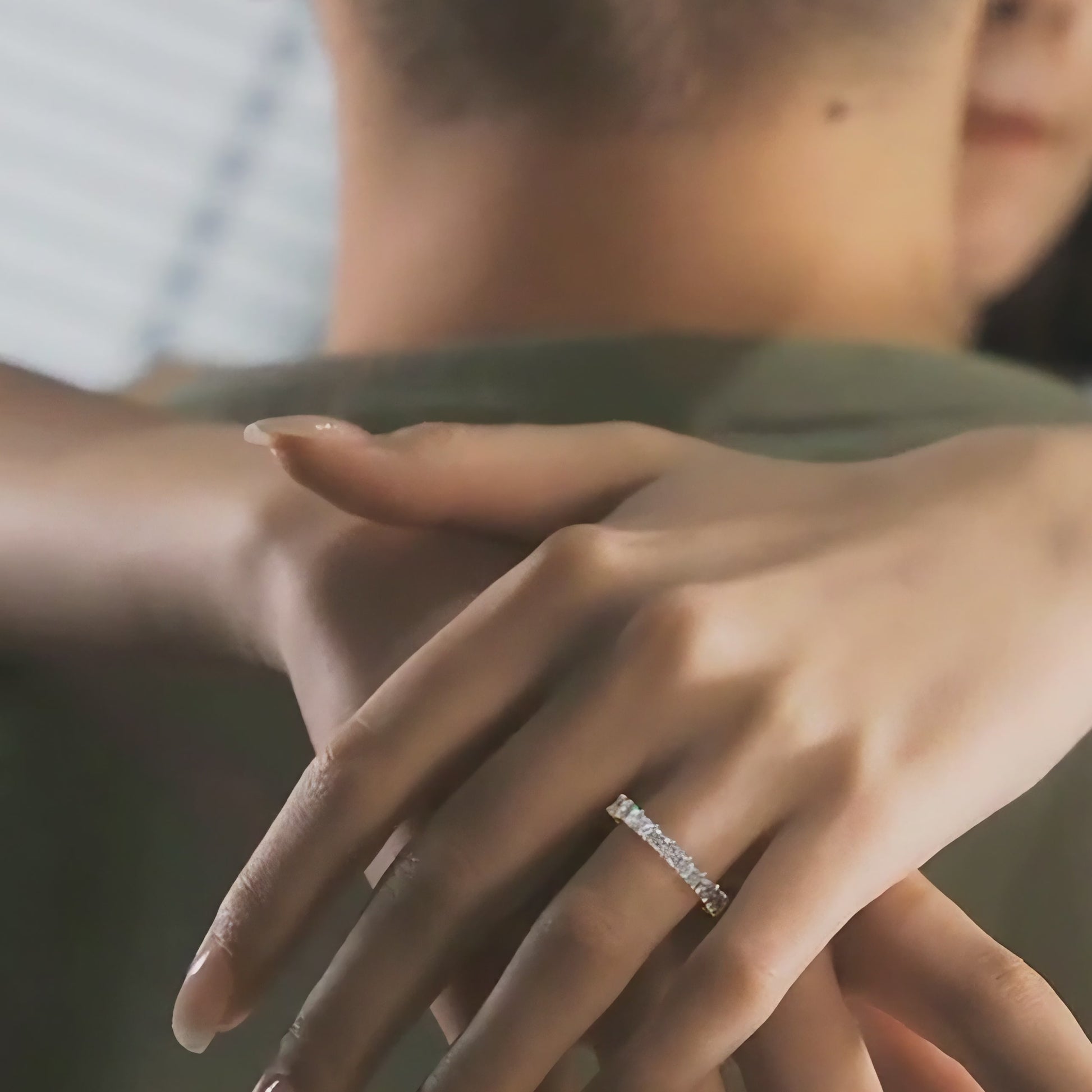 Inspired by the romantic vision of the "Galactic Embrace," the round moissanites symbolize eternally shining stars in the cosmos, arranged in a encircling setting that mimics the flowing path of the Milky Way.